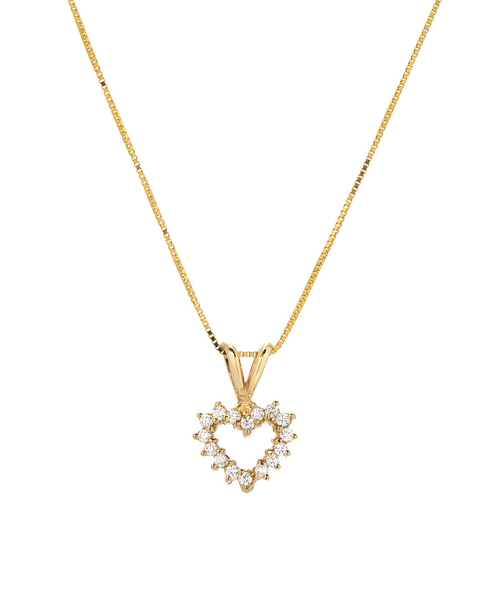 Embrace the elegance of love with our 14 Karat Yellow Gold and Diamond Open Heart Pendant Necklace, 16". This stunning necklace features an open heart pendant hand set with 16 natural 1 mm round SI 1 GH color diamonds for a total carat weight of 0.08. Wear or gift our diamond open heart pendant to symbolize eternal love and grace.